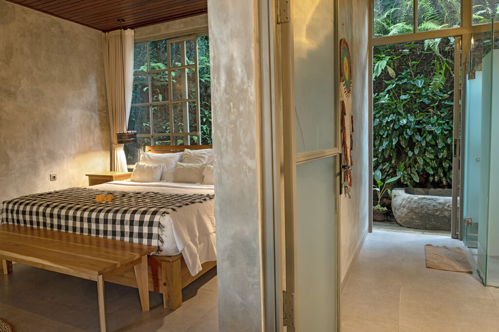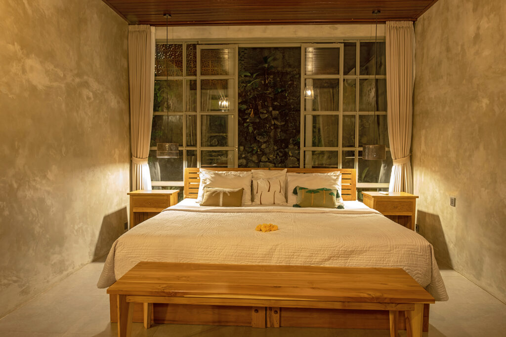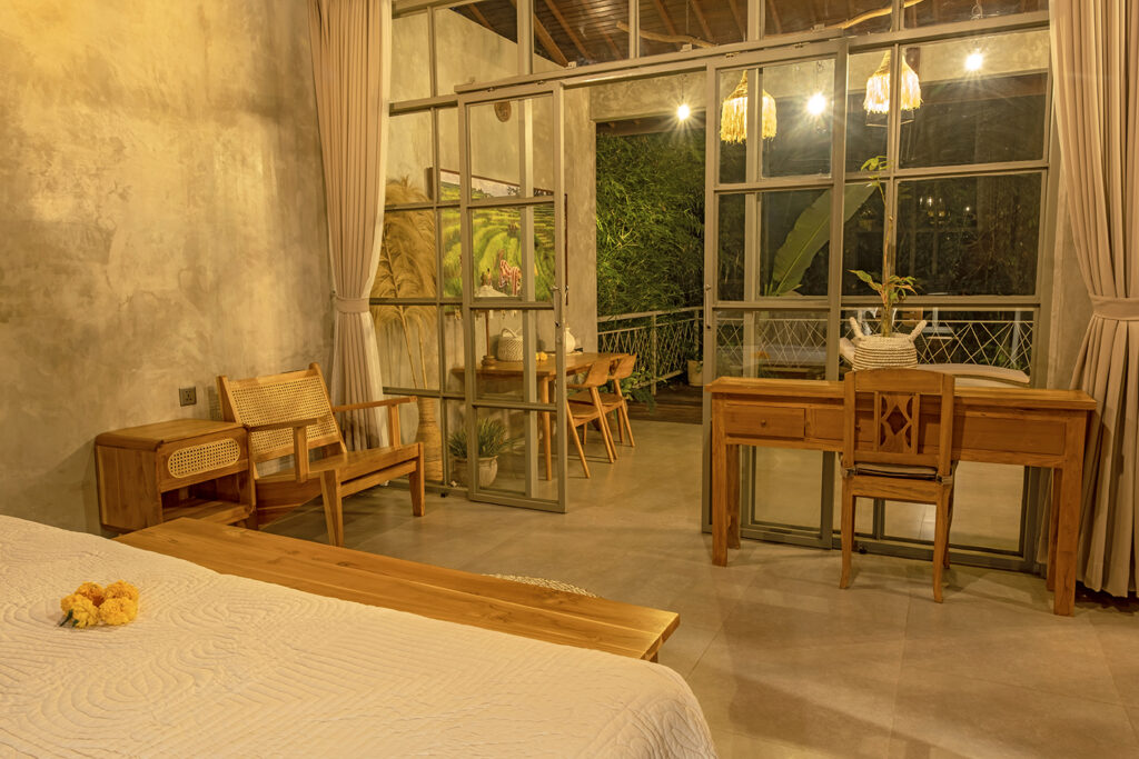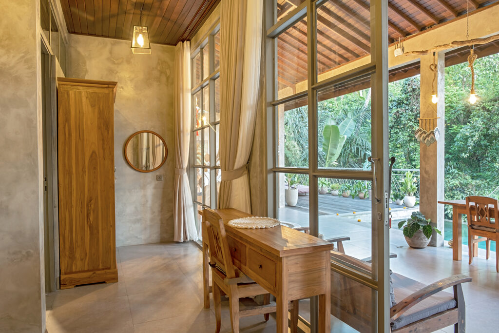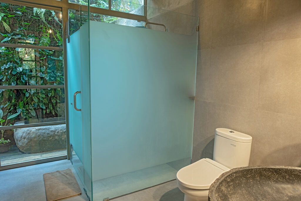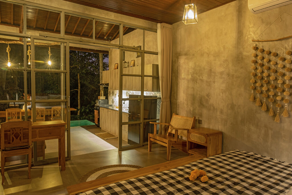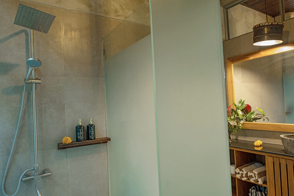 Bebalihouse has two bedrooms. The first bedroom has queen size bed and a safety box. The second bed room has two single bed that can be use as one king size bed or two single bed. Each bedroom has aircondition, teak wood cupboard, study table, teak corner sofa, restroom, inside shower, outdoor natural stone bathtub with hold and cold water.