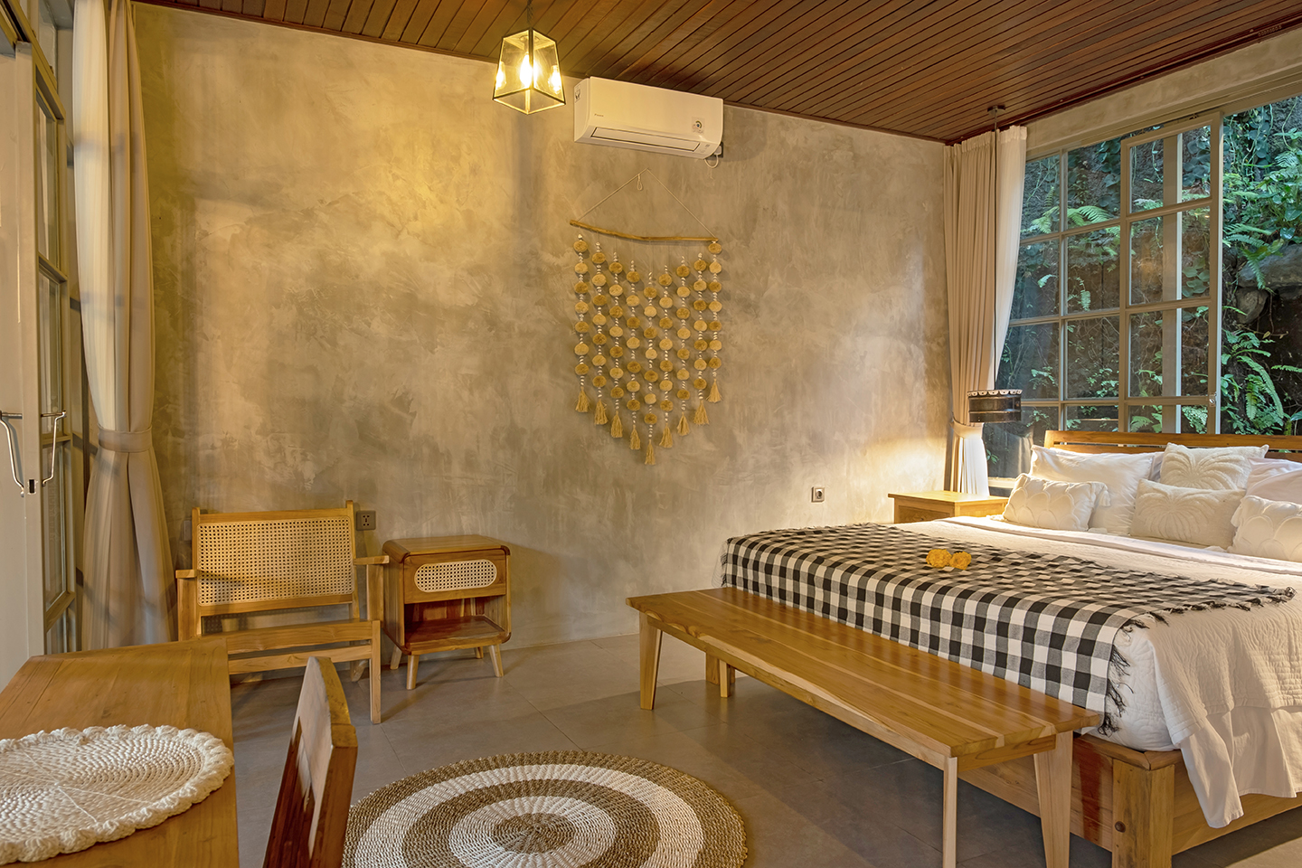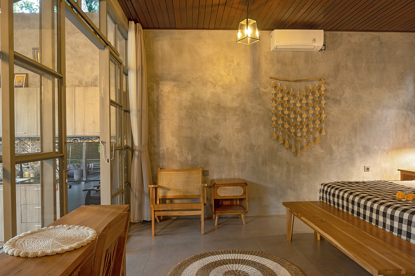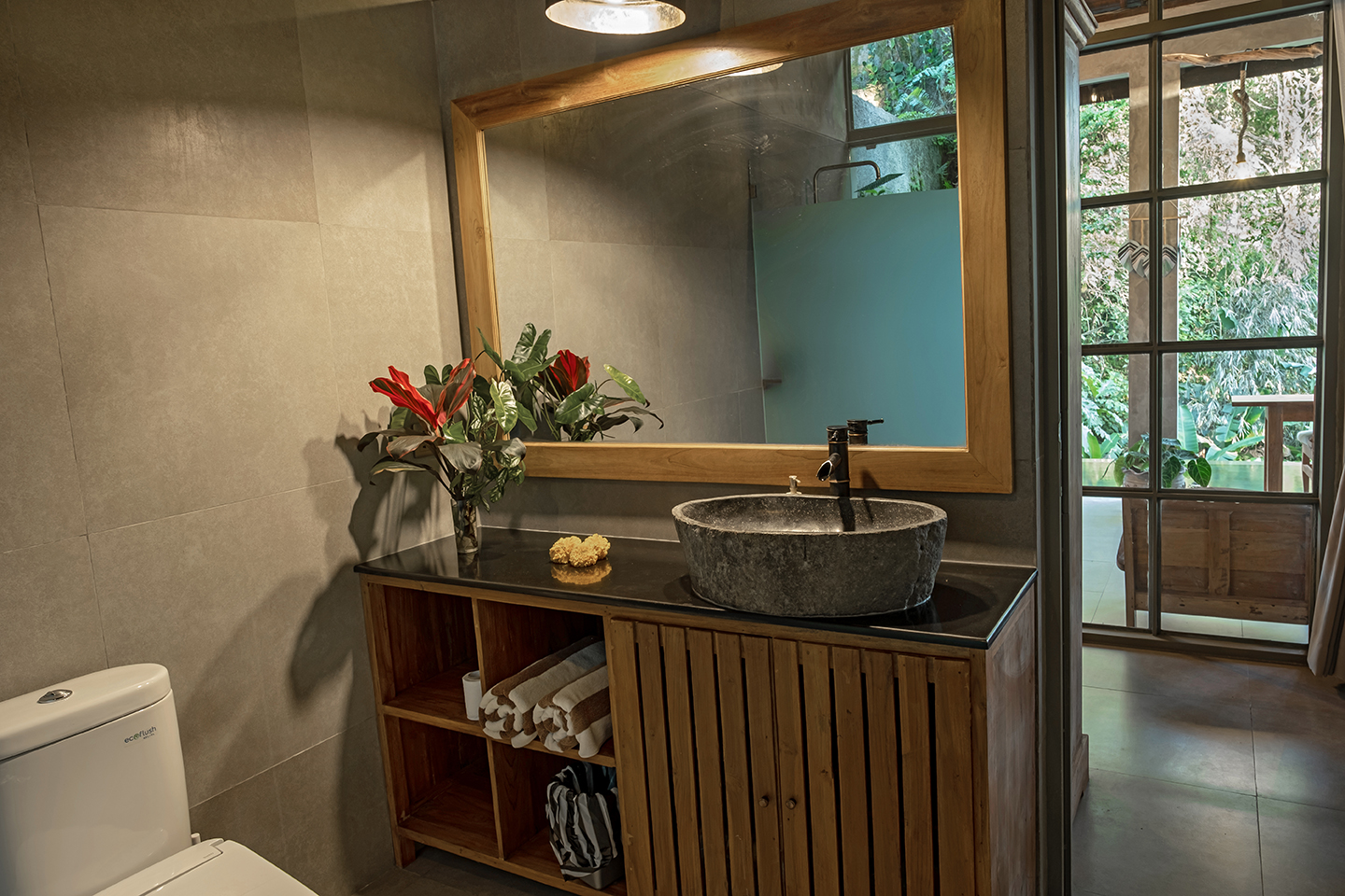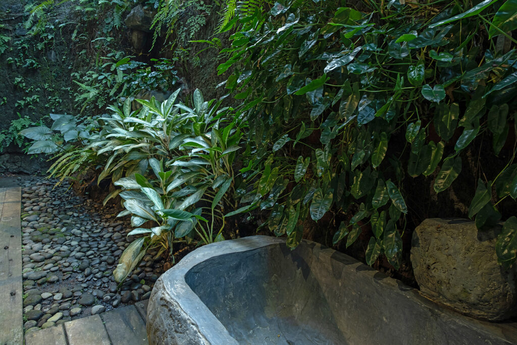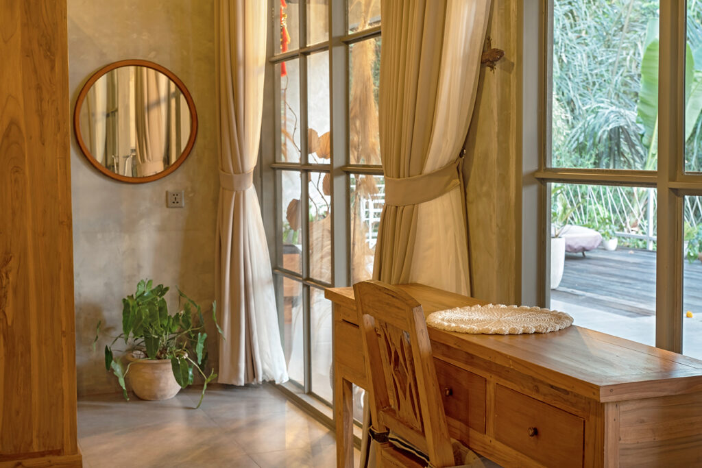 Bebalihouse has two bedrooms. The first bedroom has queen size bed and a safety box. The second bed room has two single bed that can be use as one king size bed or two single bed. Each bedroom has aircondition, teak wood cupboard, study table, teak corner sofa, restroom, inside shower, outdoor natural stone bathtub with hold and cold water.
