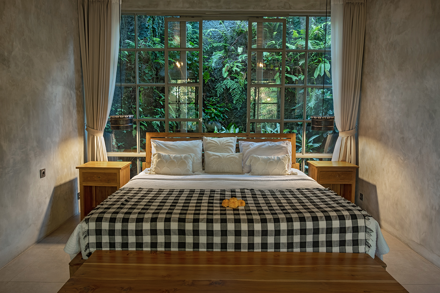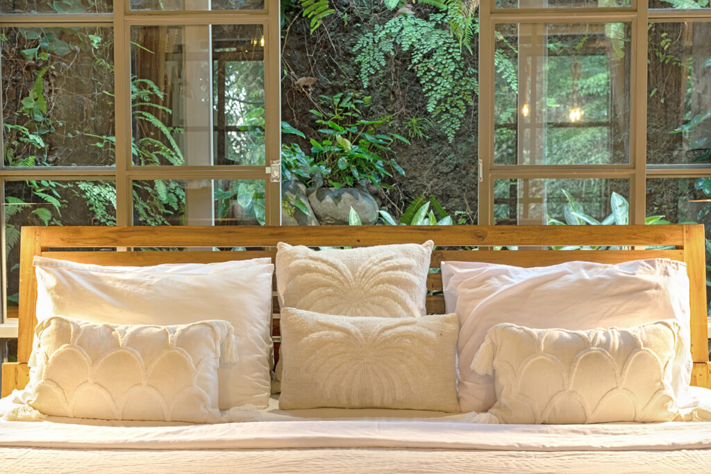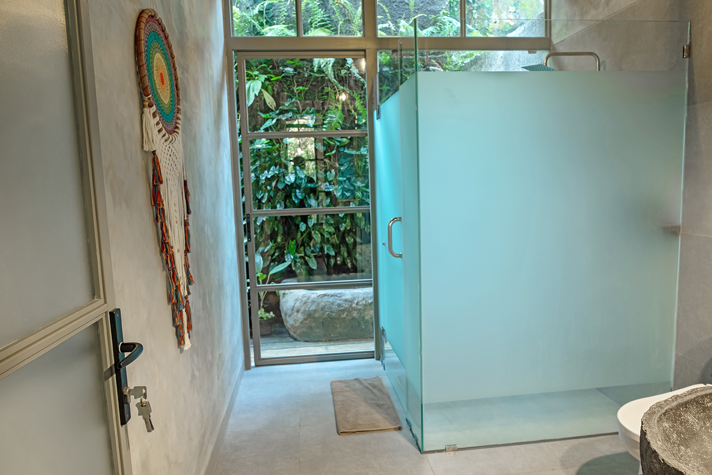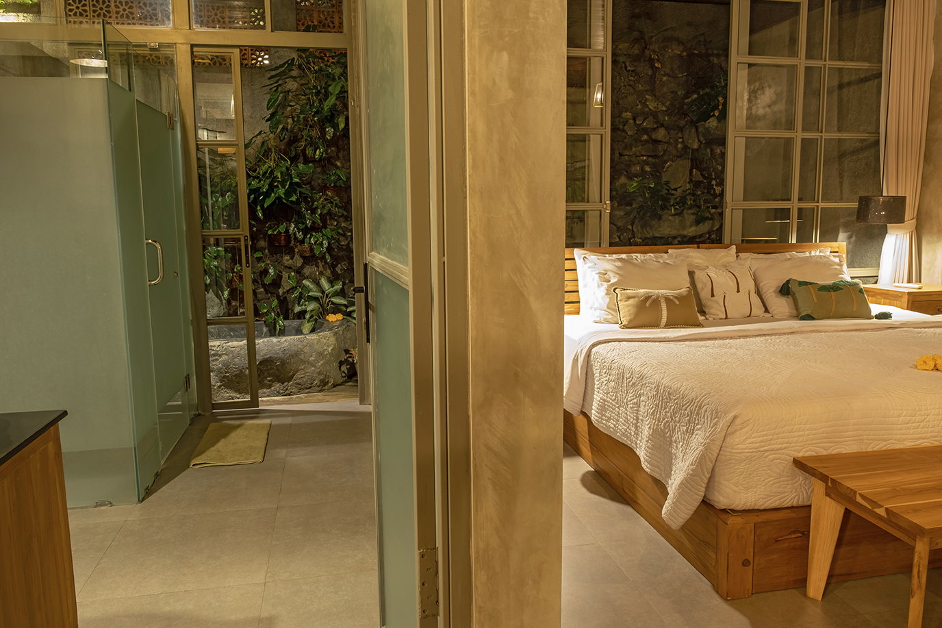 Bebalihouse has two bedrooms. The first bedroom has queen size bed and a safety box. The second bed room has two single bed that can be use as one king size bed or two single bed. Each bedroom has aircondition, teak wood cupboard, study table, teak corner sofa, restroom, inside shower, outdoor natural stone bathtub with hold and cold water.